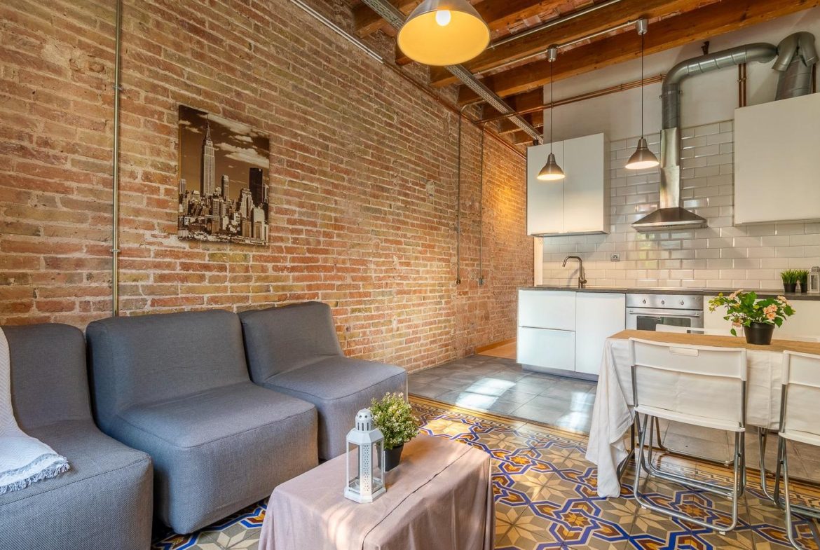 Des del primer pas, el seu estil t'envolta: terres hidràulics combinats amb parquet, parets de maó vist i sostres alts amb bigues de fusta i conductes a la vista que aporten un aire industrial elegant i càlid alhora. Cada racó reflecteix una harmonia cuidada entre l'encant original i el confort actual.