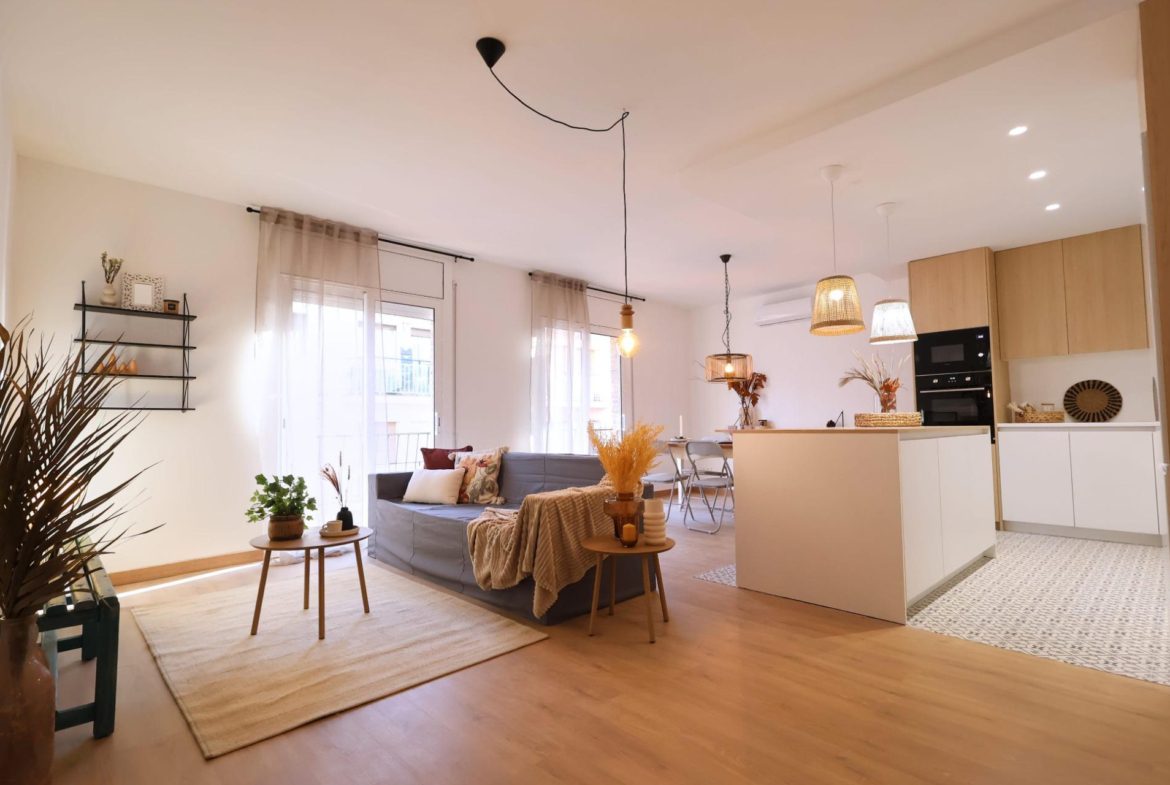 La cocina americana con isla central combina diseño y funcionalidad, integrándose con elegancia en el espacio. Dispone de dos dormitorios, un baño completo con ducha y mampara, y unos acabados de gran calidad y mucho estilo que marcan la diferencia.